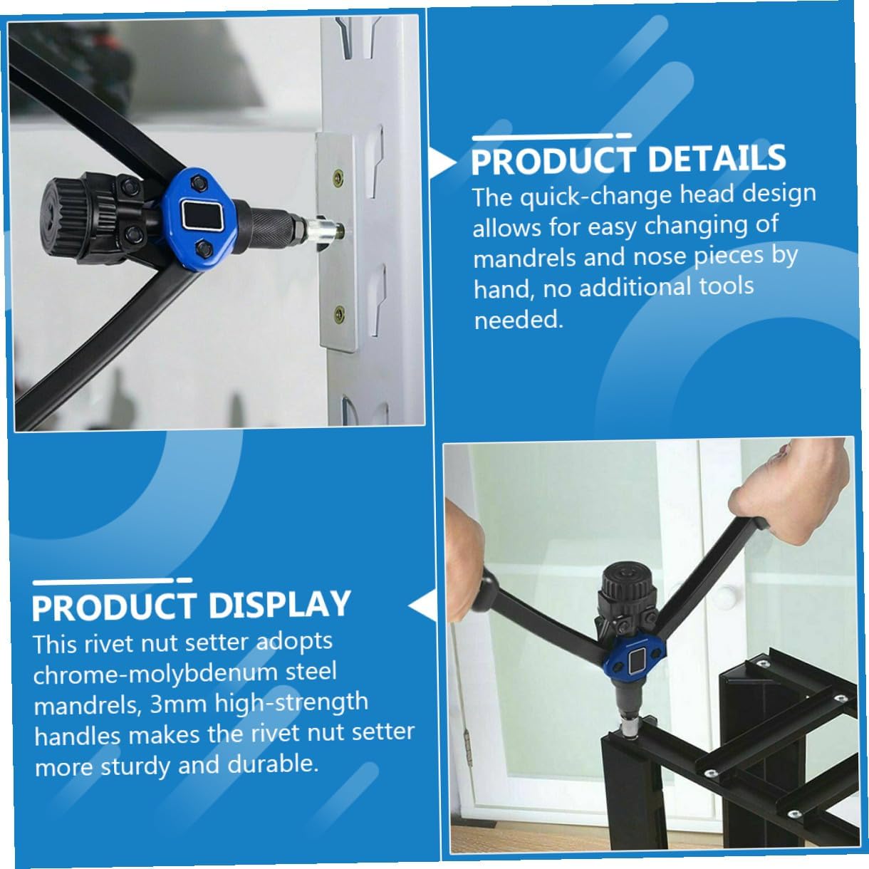 Package List 1 × Toolbox 1 × User Manual 1 × Wrench 1 × Riveting Machine 7 × Mandrels 130 × Rivet Nuts Features -Material: Chromium molybdenum steel, aluminum alloy. -Size: About 32.70X15.50X3.00cm/12.85X6.09X1.18in. -Product Info:Rivet machine kit - This thread setting riveter provides a fastener solution for wide riveting applications: body panels, bicycles attachments, furniture and decorations, etc hand riveter. -Color: Assorted. - Versatile and powerful hand nut/ thread setting riveter, takes the hard work out of setting rivet nuts nut tools. - Ergonomic handle with double compound hinge, comfortable to hold, simple to use rivet setting tool. - Wide applications and easy to carry, the toolbox is easy to store and carry Riveter Setter Kit. - It can durability, and the head design can easily replace the mandrel and nose bridge manually nut insert tool kit.Goods InformationNut Install Tool Kit This is a set of rivet nut install tool kit, made of and good craftsmanship, and can be used for a long time.rivet nut bolt kit A set of rivet nut install tool kit including a pack of different mandrels can meet your different needs.rivet tool kit This set of rivet nut install tool kit is widely used in automobile manufacturing, which brings great convenience to our work