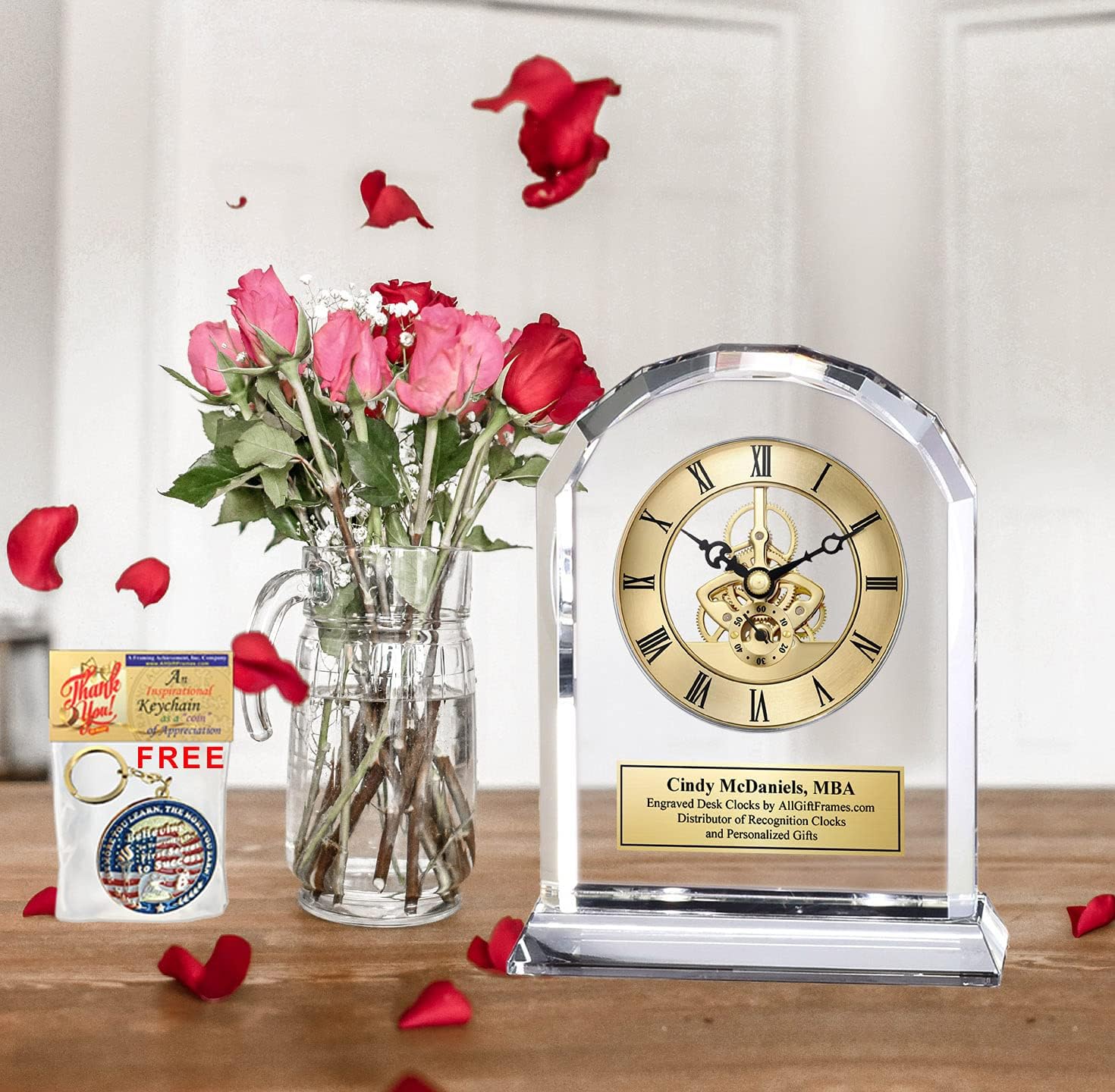 Diamond Cut Marquee Arch Clear Crystal Engraved Gold Gear Luxury Desk Clock Executive Employee Service Retirement Gift Anniversary Glass Table Top. Buy unique personalized crystal clock with gold engraving plate from our etched clock store. Crystal clear marquee diamond cut arch desk clock with DaVinci gold gear clock dial and gold engraving plaque which are unique employee service award gifts or year of service recognition awards. A perfect clock for Birthday Graduation Retirement Promotion Appreciation Service Award Present to Coworker Executive Employee Boss. Give a business years of service gift of meaningful gift of time to Him or Her. Desk clock features gold display face with beautiful hour and minute time movement needle embedded in crystal. Elegant roman numerals in the clock dial complete its luxurious display of time. Show timepiece that personalized recognition congratulation appreciation message corporate gift with clock is a wonderful idea for a sentimental meaningful coworker anniversary gift idea for that special employee friend executive boss or parents. A service award executive gift that has meaning to employee of the year or month retiree. Unique business present for employee boss coworker colleague. Our etched sentimental personalized desk clock will sure appeal to your years of service award person. Item Clock-SE-CM0019