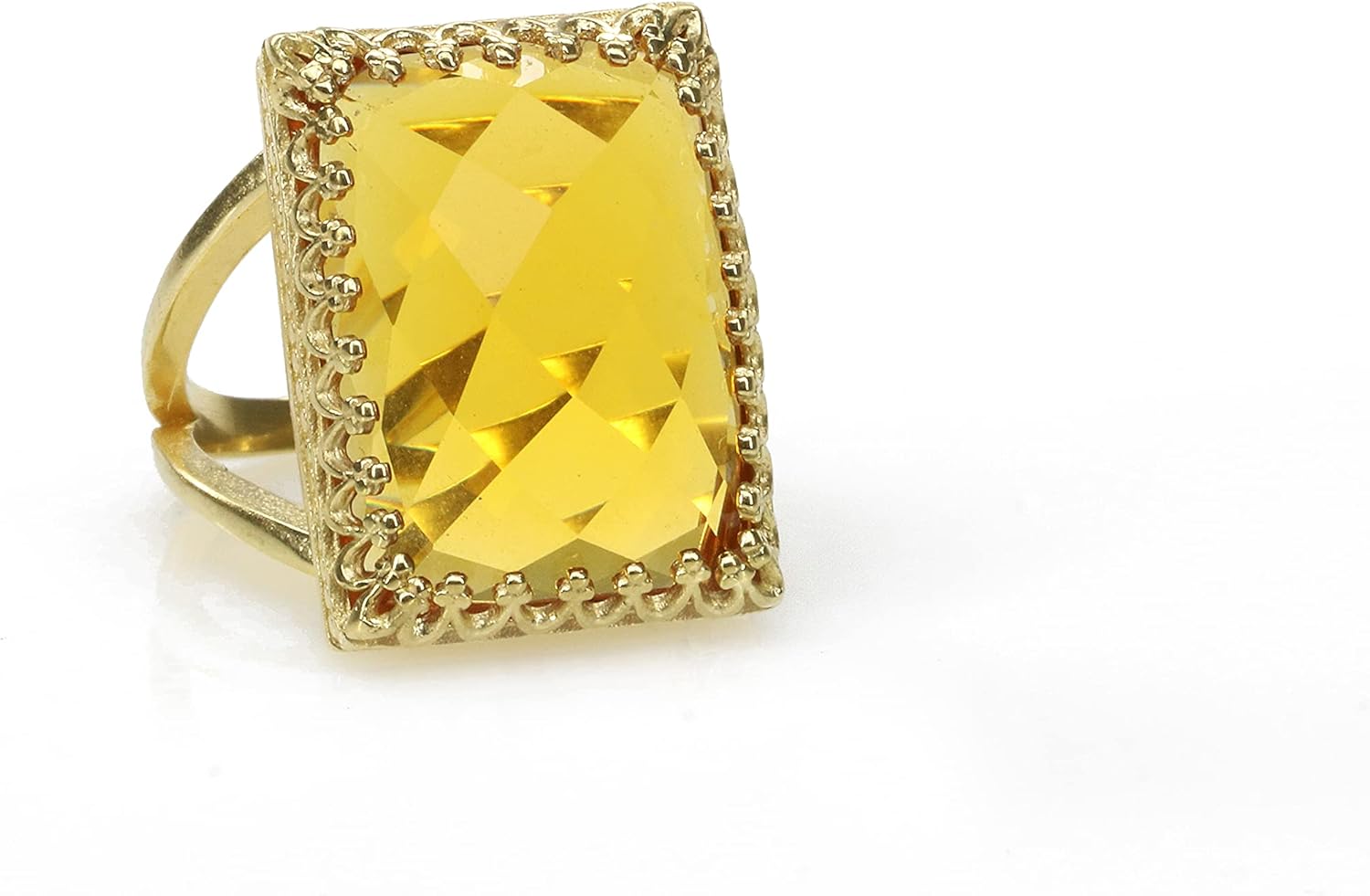 A magnificent, large statement ring with a yellow Citrine stone held in an intricate 14k gold filled setting. This custom birthstone ring will add a dazzling luster and vibrant luminescence to your looks.
