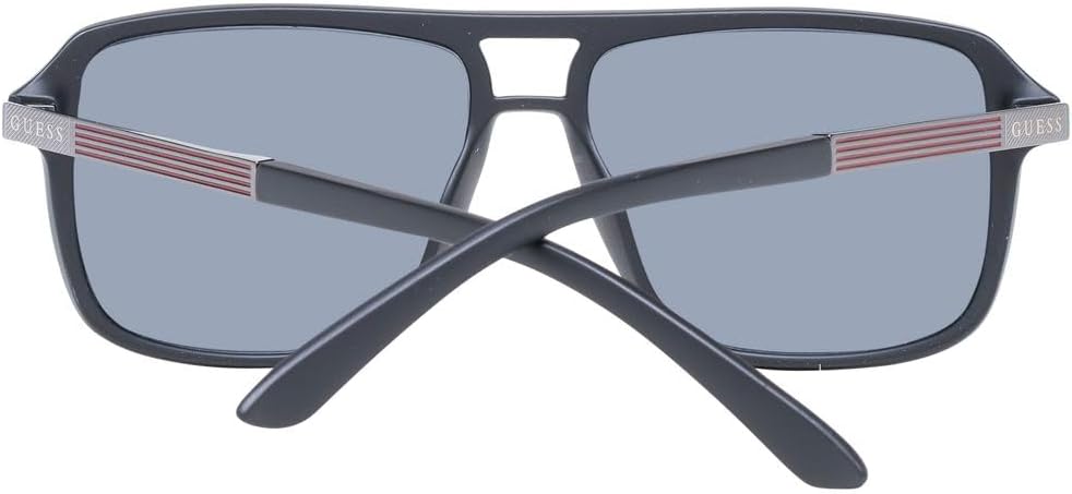 Protect your eyes on sunny days with the sleek style of the GUESS GF5085 sunglasses. Square aviator design with fixed nose pads. Plastic frame and metallic brand detail at temple. UV coated plastic lens. Soft case included.